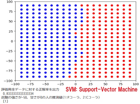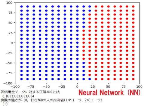 sample_coca = np.c_[-50, 0]#炭酸の強さが-50, 甘さが0の人は上記にはいないが、Pコーラの1に分類されるはず