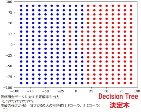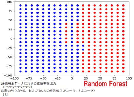 #下の図は、どこでコーラ派とペプシ派が分かれるかを表示した図 赤がCコーラ、青がPコーラ 直線で分けるモデル、曲線で分けるモデル、曲線ではなく領域で分けるモデル(決定木,ランダムフォレスト)の違いを確認する。
