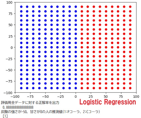 sample_coca = np.c_[-50, 0]#炭酸の強さが-50, 甘さが0の人は上記にはいないが、Pコーラの1に分類されるはず